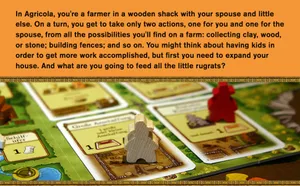 “Agricola is both streamlined and very concise in its approach. All players are competing for the same limited resources in a game that is often decided by only a few points. Every round, every turn matters.”