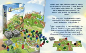 Carcassonne is a tile-placement game inspired by the medieval fortress in southern France where players fill in the countryside around the fortified city. Players draw and place tiles depicting cities, roads, monasteries, and fields, then can place followers (meeples) on features to score points when they are completed. The player who makes the most strategic placements of tiles and followers will score the most points and win the game.