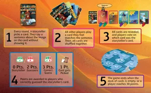 Dixit is a creative storytelling party game where one player acts as storyteller, giving a clue about one of their beautiful, surreal artwork cards, while other players try to guess which card matches the clue. Players score points by finding the storyteller's card and having others guess their own submitted cards, creating a balance between being too obvious or too obscure.