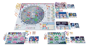 A Eurogame strategy game where players lead space agencies to build a permanent base in the Shackleton crater at the Moon's South Pole. The game features a modular sandbox system with 7 unique corporations (3 chosen per game), worker placement mechanics, and drafting shuttles with astronauts and resources over 3 rounds.