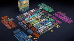 A large-scale strategy board game of skill and intrigue set in an ancient, crumbling kingdom where players are heirs vying for control of a vacant throne. The game features card-driven conquest mechanics with heavy emphasis on bluffing, blind bidding, and tactical maneuvering as players attempt to claim locations and outmaneuver their opponents.